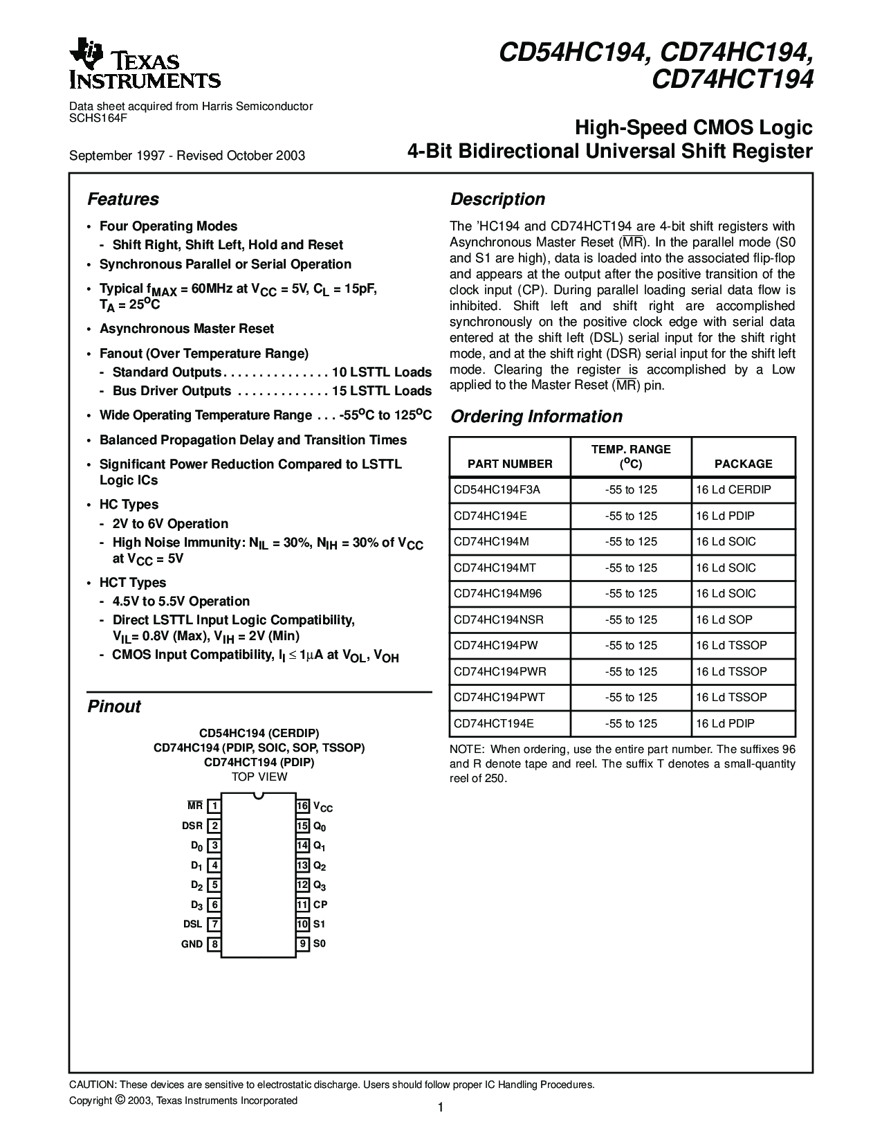 这 ’HC194 和 CD74HCT194 是 4-有点 轮班 寄存器 与