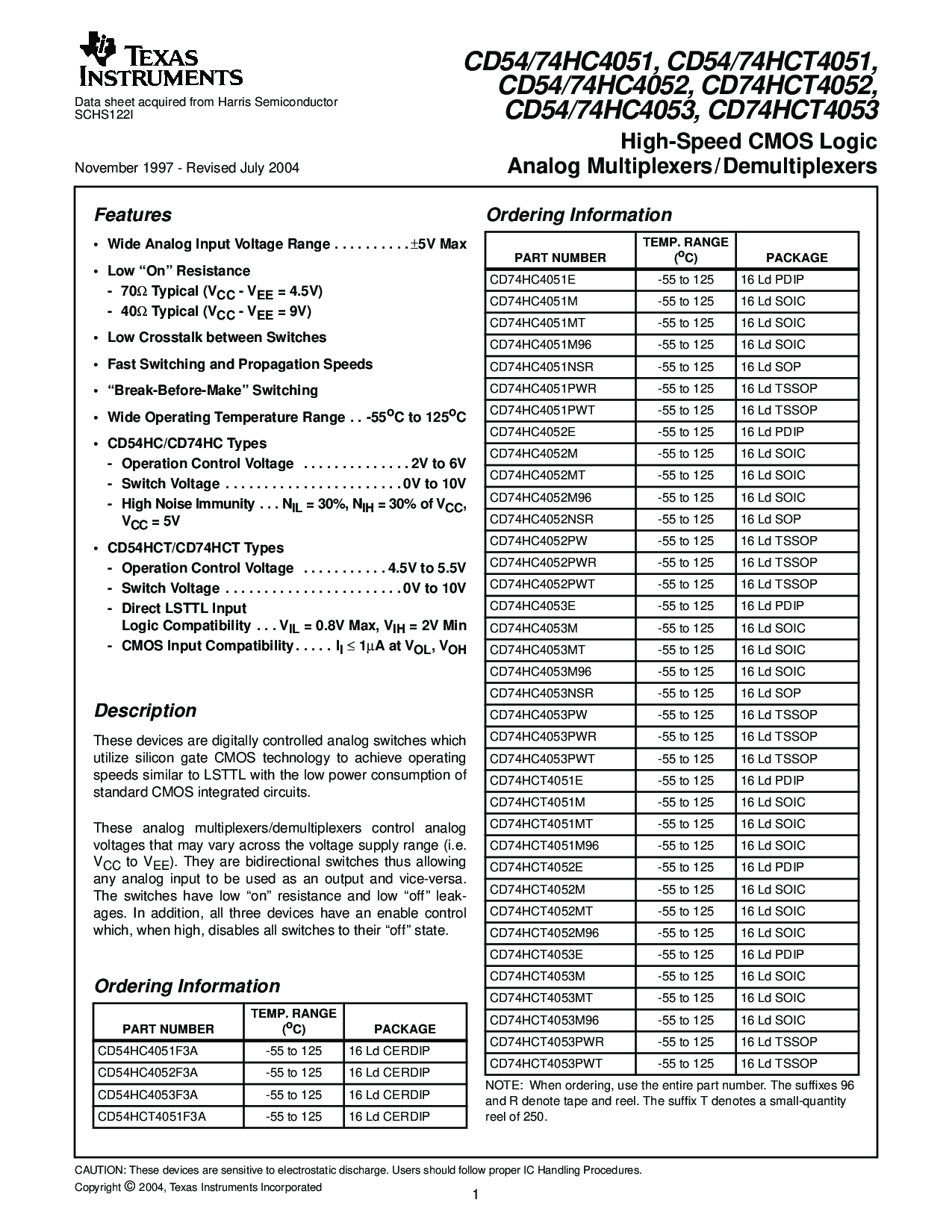 CD74HCT4052M96 -55 至 125 16 ld soic