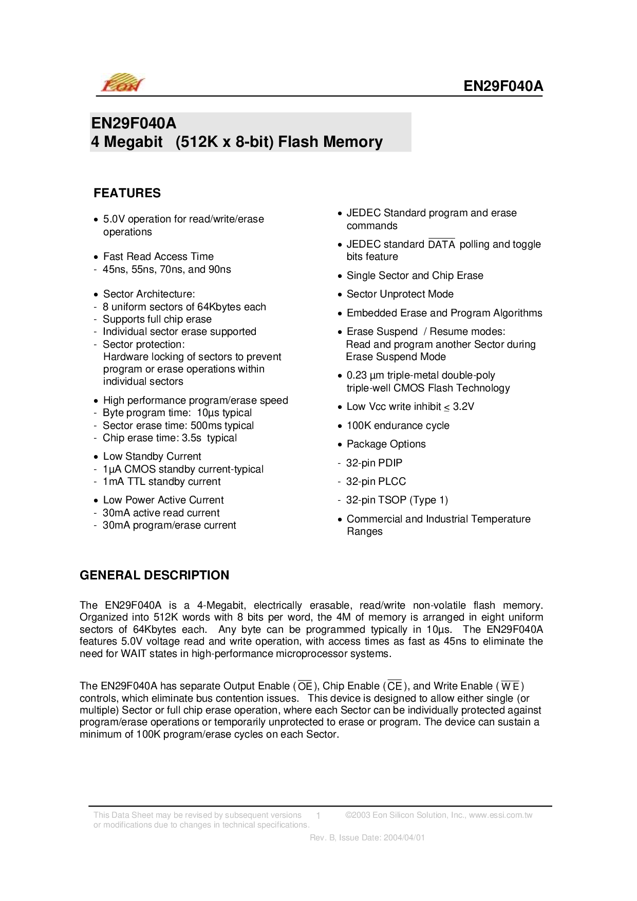 浏览型号EN29F040A-90JCP的Datasheet PDF文件第2页