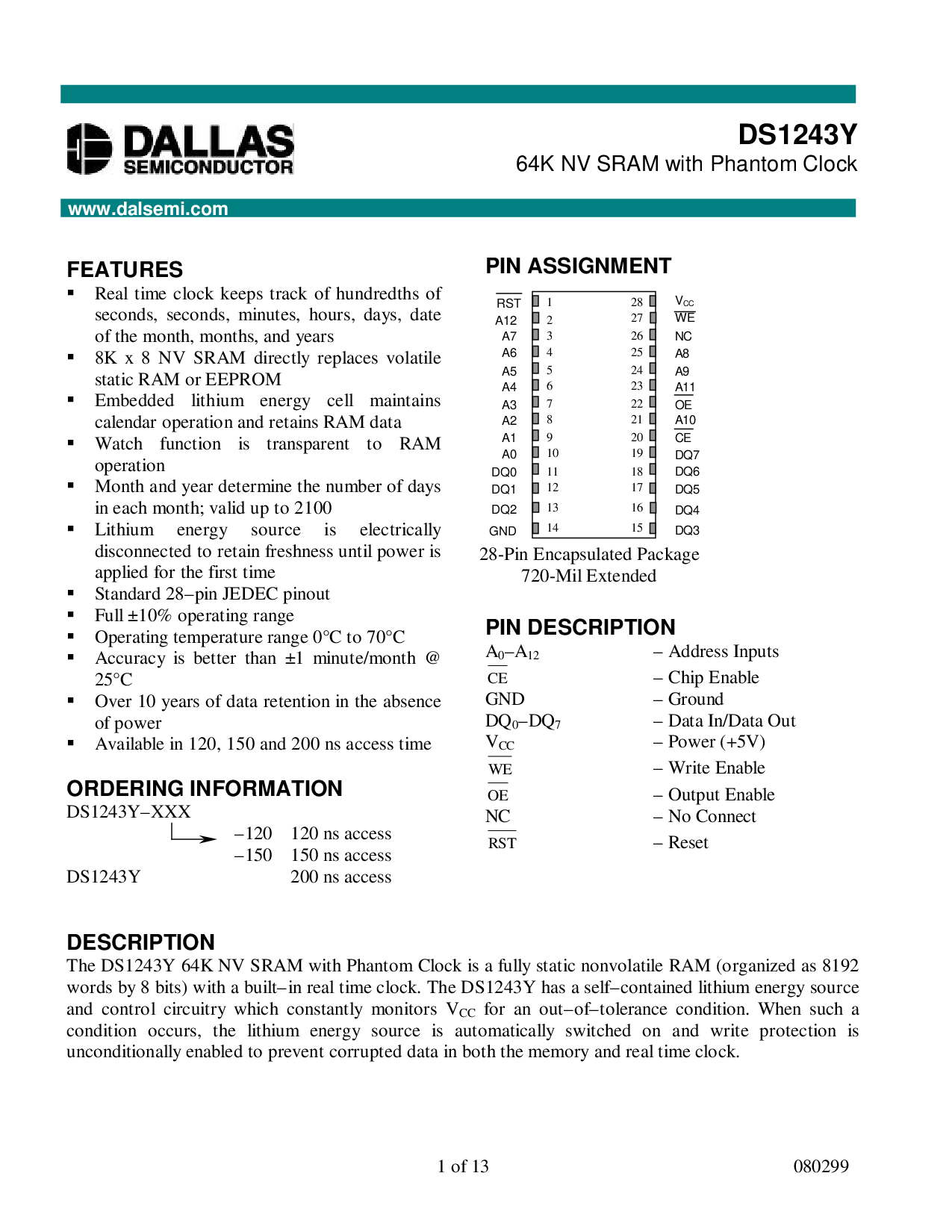 这 ds1243y 64k nv sram 与 幻影 时钟 是 一个 完全 静态 非挥发性 ram (有组织的 作为 8192
