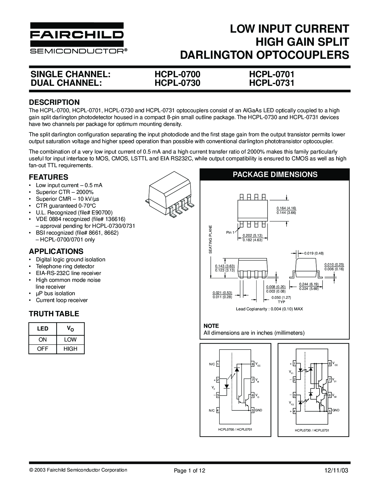 LOW INPUT CURRENT HIGH GAIN SPLIT DARLINGTON OPTOCOUPLERS