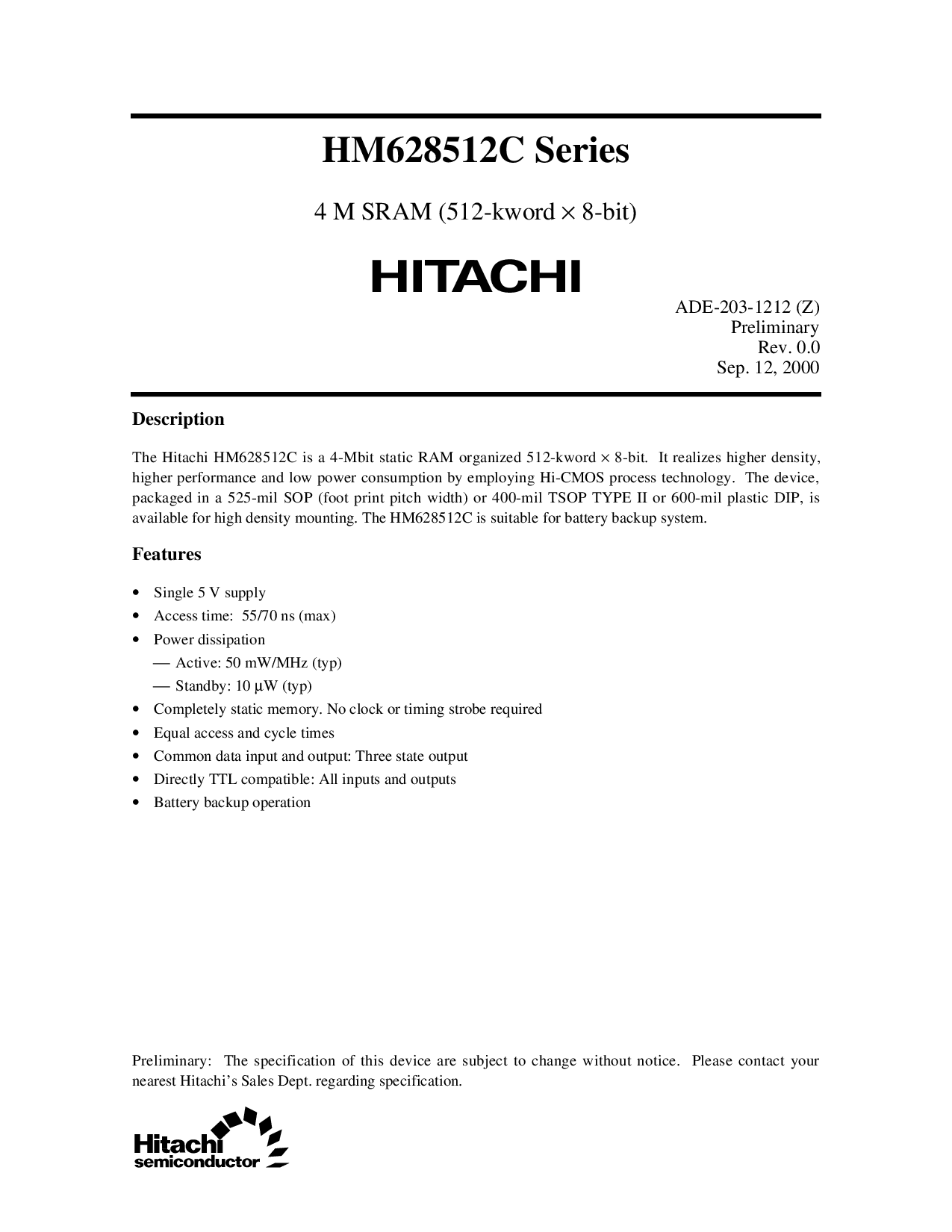 这 hitachi hm628512c 是 一个 4-mbit 静态 ram 有组织的 512-kword