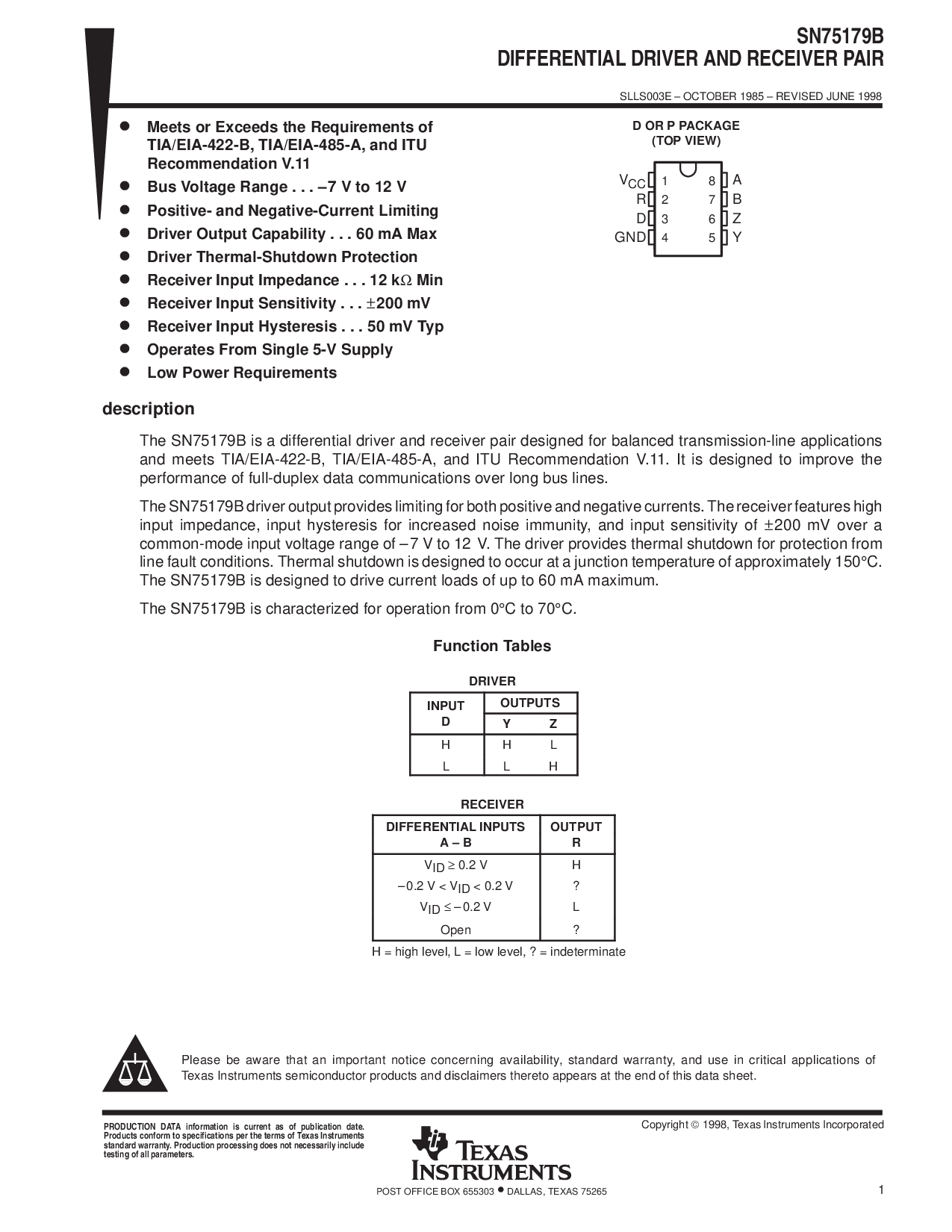 这 sn75179b 驾驶员 输出 提供 限制 用于 两者都有 正 和 负 电流. 这 接收器 特点 高