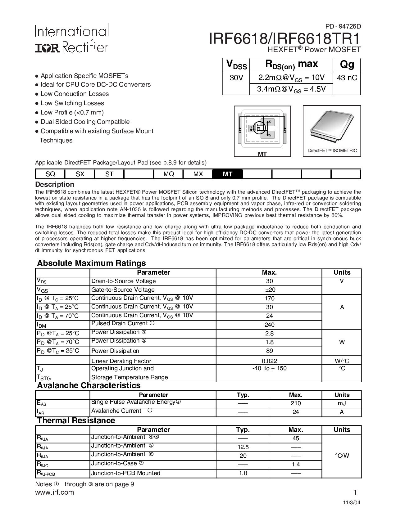 这 irf6618 余额 两者都有 低 电阻 和 低 费用 沿 与 超 低 包装 电感 至 减少 两者都有 传导 和
